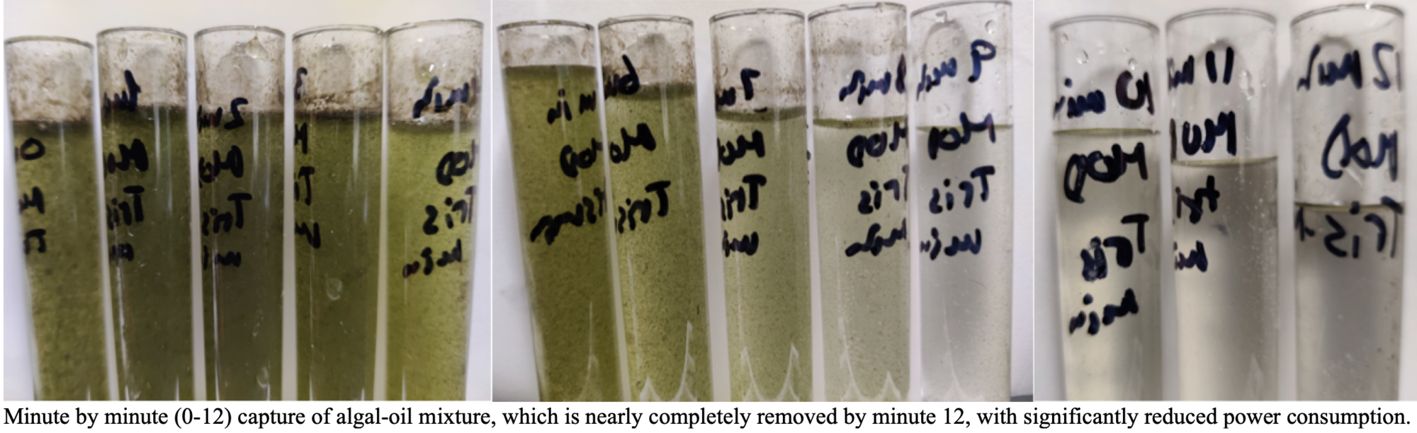 Novel laminar flow microbubble flotation was invented (in 2017) as a low cost alternative to DAF. Smaller bubbles have higher surface energy driving attachment to algal cells. Smaller “building block” bubbles increase floc stability under laminar flow conditions. Laminar flow ensures better floc stability, which delivers a high level of separation with minimal disruption. Reepel has demonstrated low cost recovery for solid based, solid and liquid based flotation systems of oil, algae/particle, or oil+particle/algae separations. An example of separation is seen in the image below.